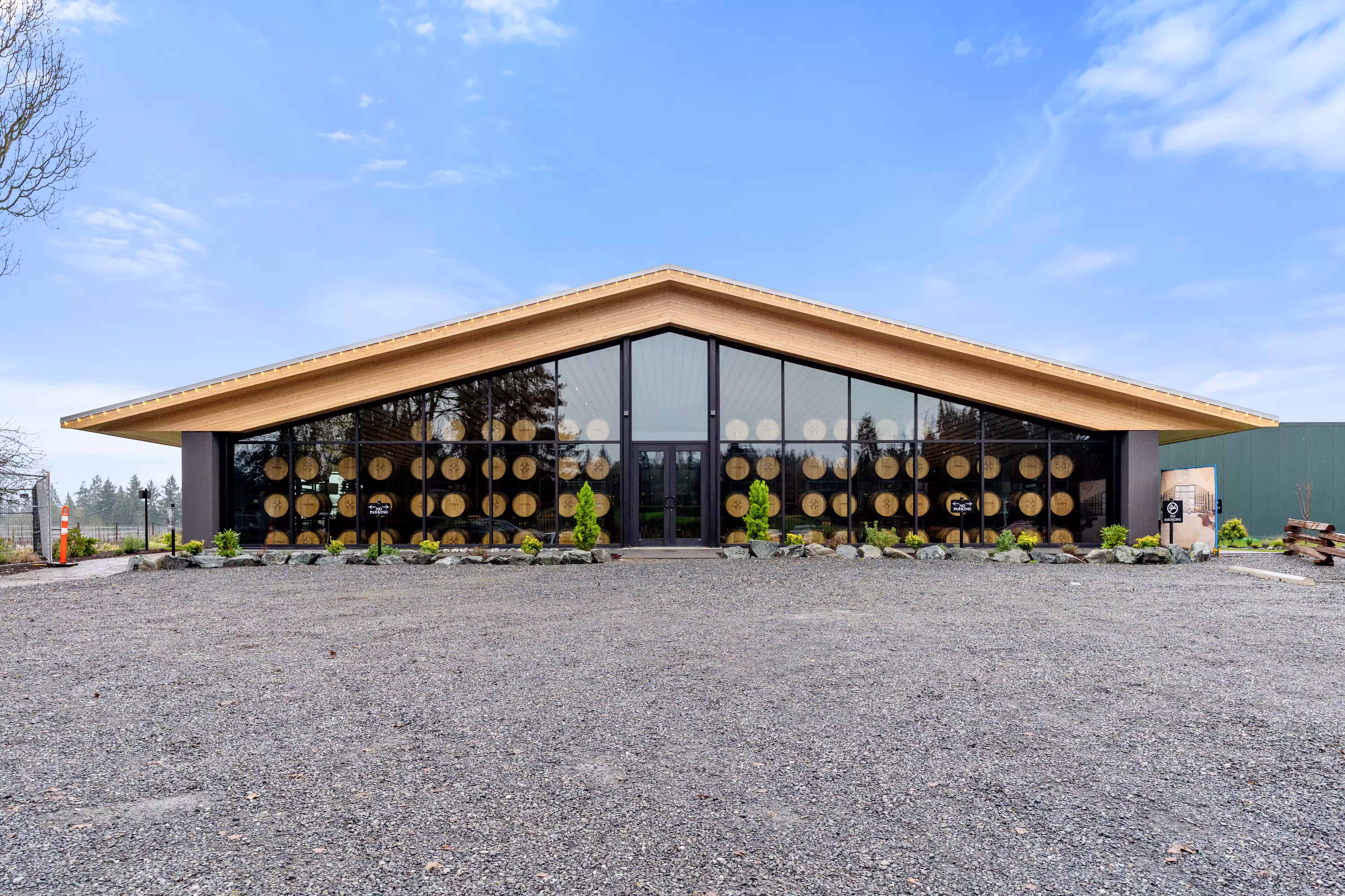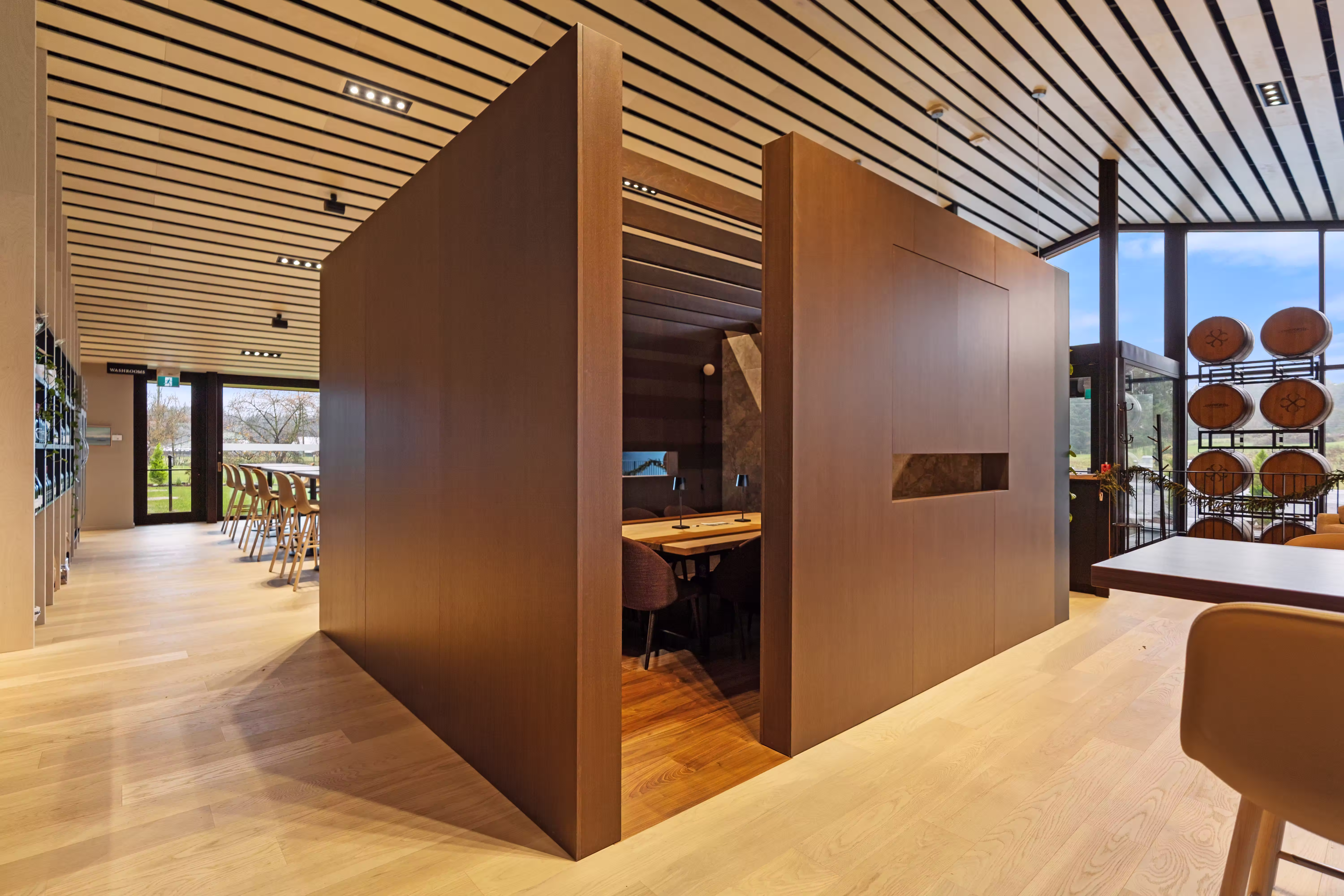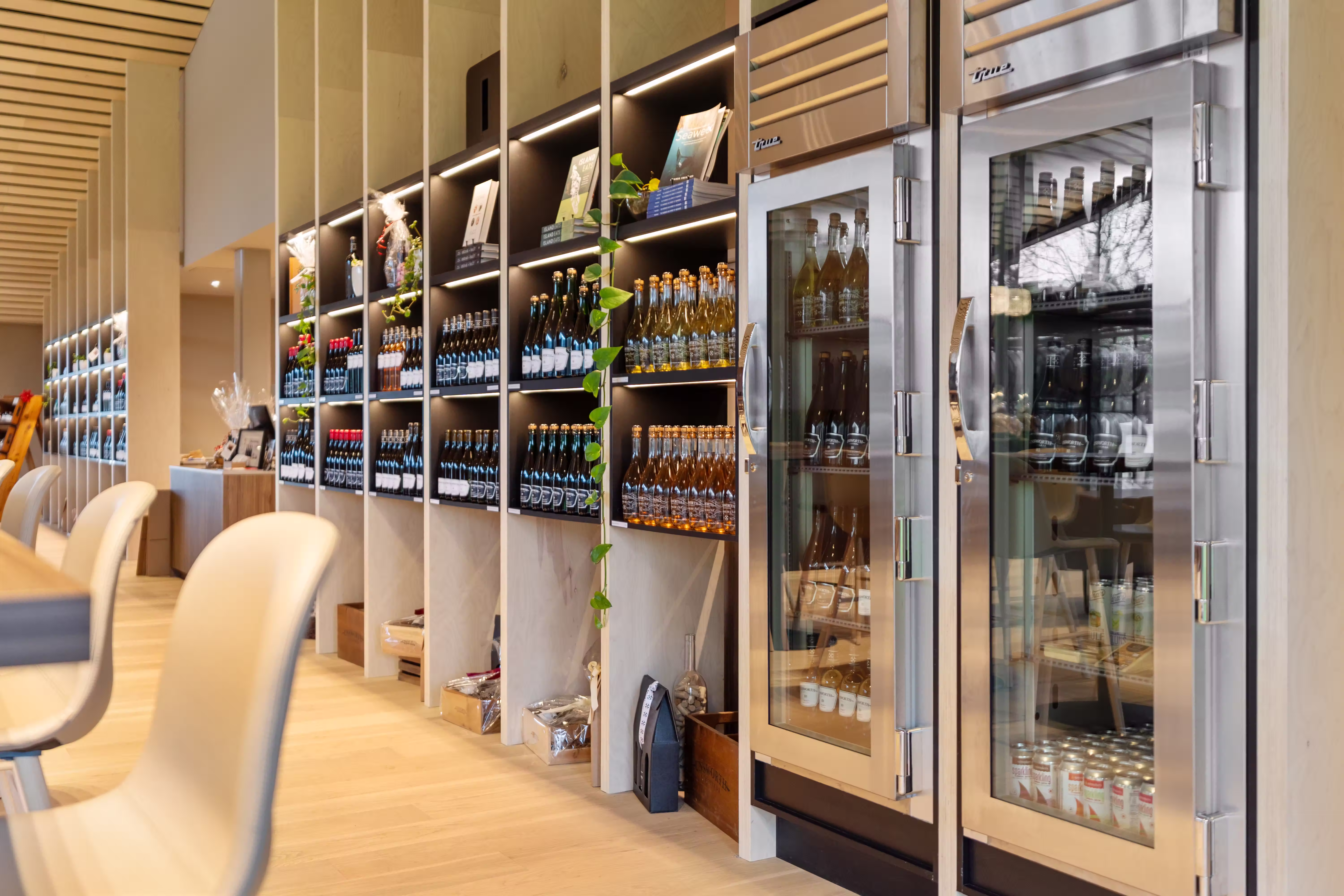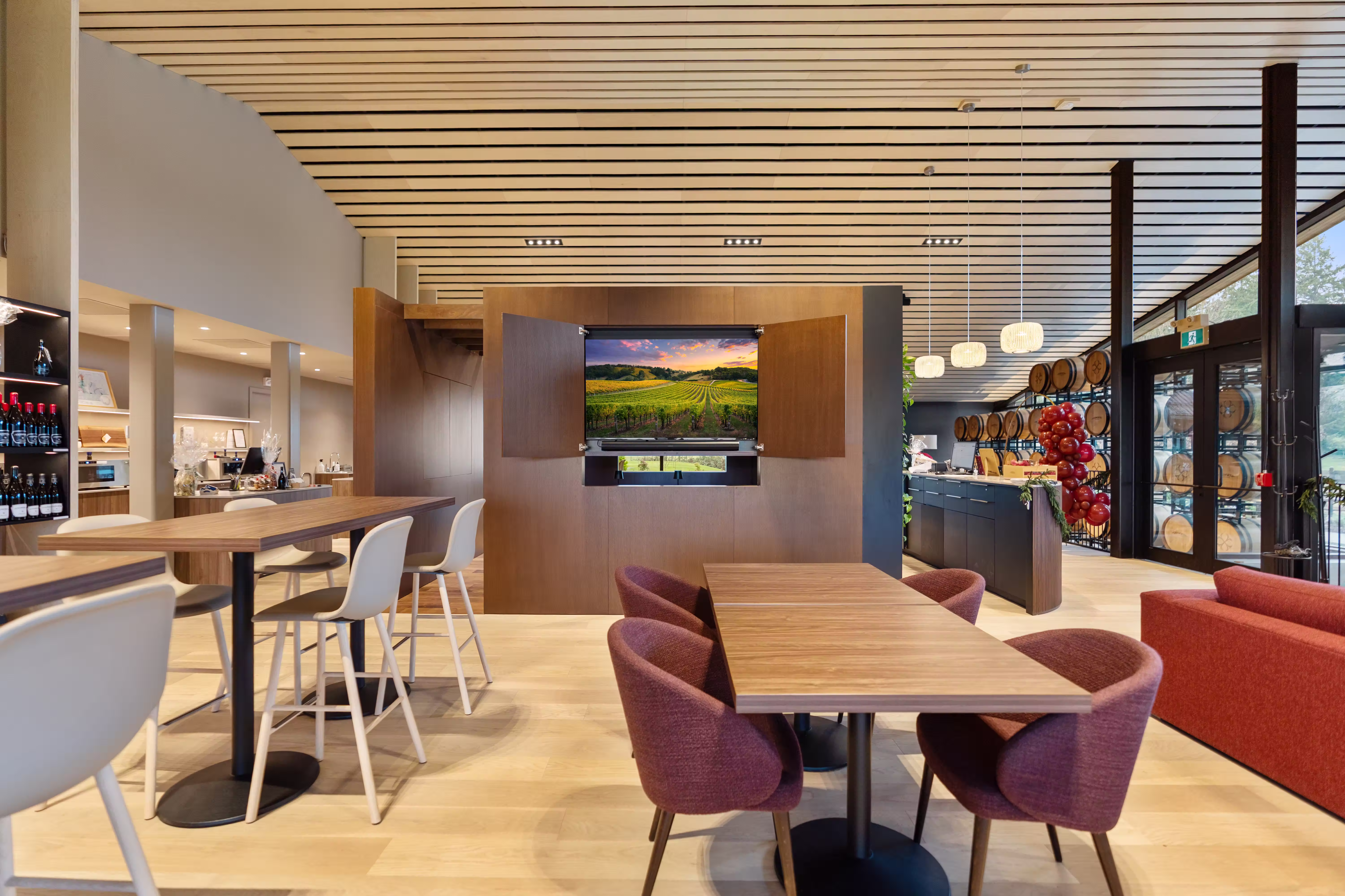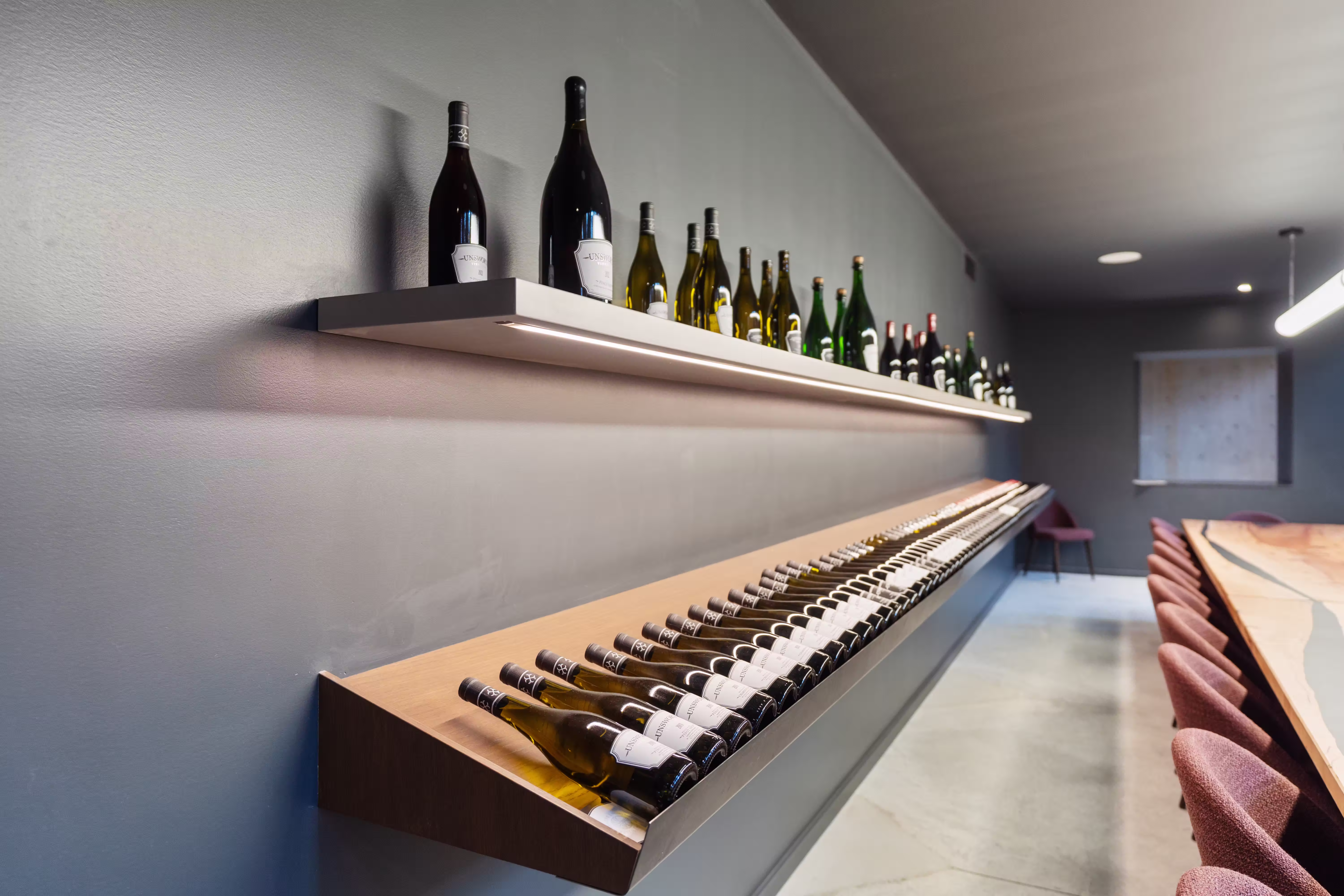 For this project, we had the pleasure of working with the Simic Architecture and Heatherbrae teams to bring a remarkable vision to life for the owners of Unsworth Winery. Set in a stunning rural landscape, the new tasting room rises naturally from its surroundings, offering an experience that rivals many of the province’s most memorable wine spaces. As guests step through the doors, they’re welcomed by our custom-built reception area, setting the tone for everything that follows. Just behind it, the private tasting room pairs warm materials with intentional detailing, inviting slower moments and private tastings. Integrated TVs immerse guests in the beauty of the surrounding vineyards and property. Our scope also included the slat ceiling overhead, the vertical fins defining the back of the room, and the back-of-house cabinetry that keeps the space running seamlessly. And downstairs, you’ll find a deceptively strong floating shelf, purpose-built to cradle nearly ninety-nine bottles of wine on the wall…